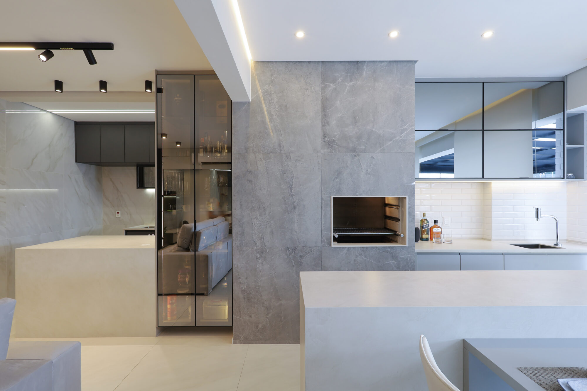 Fabiana e Elizabeth contam que neste projeto foram utilizados acabamentos modernos como uma porta mimetizada logo no hall de entrada que leva para o escritório. Nos banheiros foram utilizados novos acabamentos também para os metais que completam o visual da bancada esculpida em porcelanato. Na área do living, cozinha e área gourmet, a integração foi a base para o projeto.